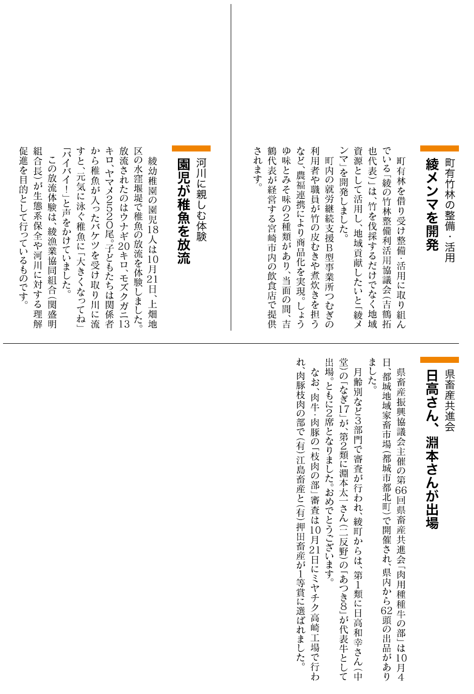 くらし まちの話題 17/18 前の記事 次の記事 発行日 : 2025年11月26日 自治体名 : 宮崎県綾町 広報紙名 : 広報あや 2025年12月号(286号) ※詳しくは広報紙P14.15をご覧下さい。 Tweet シェアする くらしの情報(12月)-お礼- その他のお知らせ(広報あや 2025年12月号(286号))
