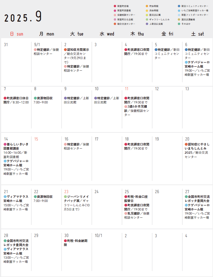 くらし 9月のカレンダー 12/15 前の記事 次の記事 発行日 : 2025年08月25日 自治体名 : 宮崎県新富町 広報紙名 : 広報しんとみ 令和7年8月号 Tweet シェアする [募集]宮崎県産業開発青年隊募集要項 今月の題字