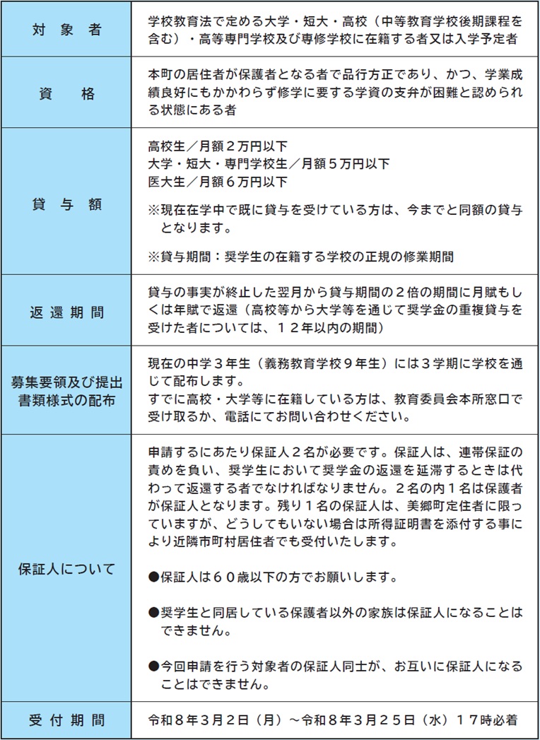 子育て [お知らせ] 令和8年度 美郷町育英奨学生を募集します 16/28 前の記事 次の記事 発行日 : 2026年02月01日 自治体名 : 宮崎県美郷町 広報紙名 : 広報みさと 2026年2月号 本町では、独自の育英奨学金制度を設けており、次の要領で令和8年度の新規申込を受け付けます。 お問合せ:教育課 【電話】66-3608 Tweet シェアする [お知らせ] 宮崎ねんりんピック2026 参加者募集 [お知らせ] 定住による奨学金返還免除・育英奨学金の返還未収金の回収業務委託について
