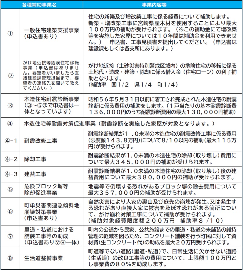 ※昭和56年5月31日以前に建てた住宅のリフォームをお考えの方は(1)一般住宅建築支援事業と(4)-1耐震改修工事の補助が同時に受けられます。リフォームをお考えの方は建設課にご相談ください。