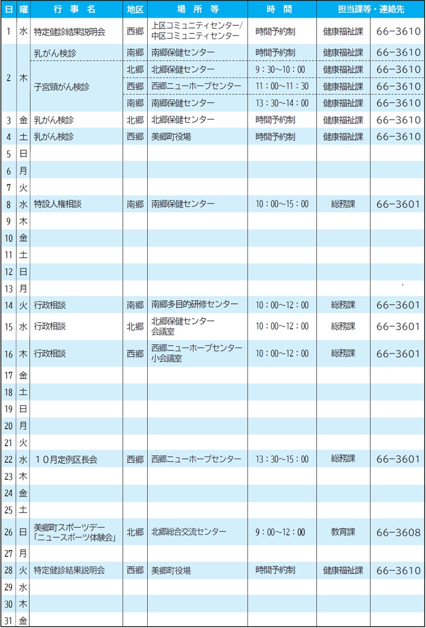 くらし 美郷町10月行事予定表 29/31 前の記事 次の記事 発行日 : 2025年10月01日 自治体名 : 宮崎県美郷町 広報紙名 : 広報みさと 2025年10月号 ■美郷町10月行事予定表 ※行事は、都合により変更になる場合もありますので御了承ください。 Tweet シェアする [保健だより] まずは毎日、あと一皿ずつ野菜と果物をプラスしてみましょう ご成人おめでとうございます!