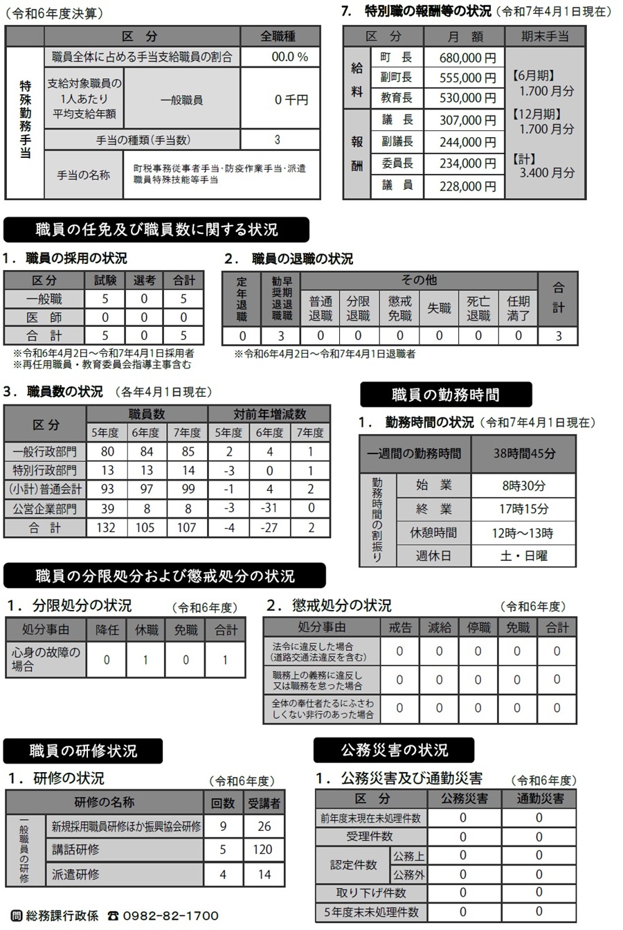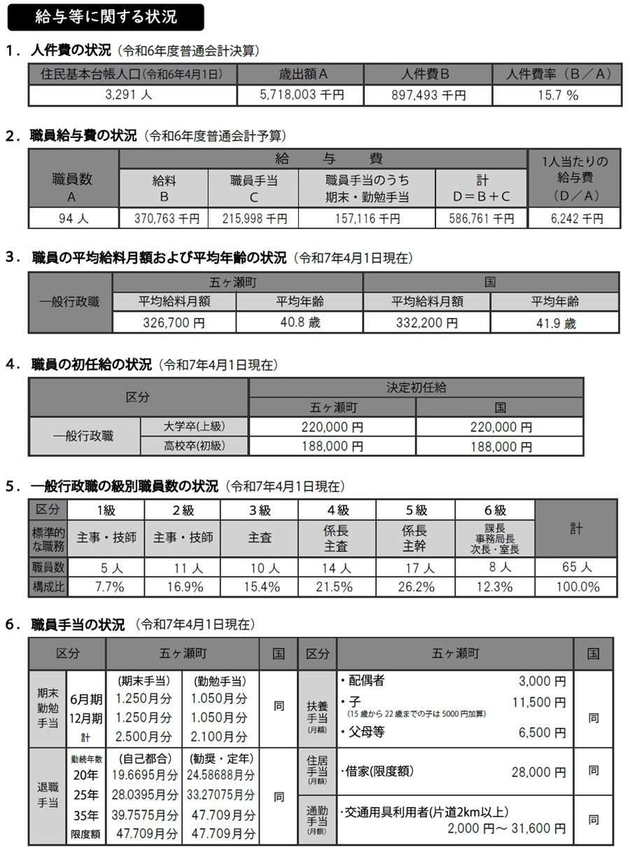 職員の給与は、民間企業を参考とした国家公務員やほかの町村の給与を参考にしながら、町議会の審議を経て条例や規則などで定められています。町民のみなさんのご理解をいただくため、五ヶ瀬町人事行政の運営等の状況の公表に関する条例に基づき、職員等の給与等の状況について公表します。
