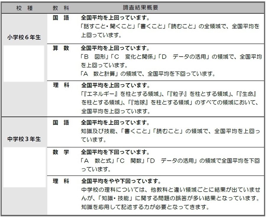 今後も五ヶ瀬町では、育てたい資質・能力を意識した授業を行い、各教科の学力向上を目指すとともに、五ヶ瀬教育グランドビジョンにもうたわれている21世紀型学力に対応すべく、子どもの認知的能力と非認知的能力をバランスよく育むことに努めていきたいと思います。結果の概要については以下のとおりです。
