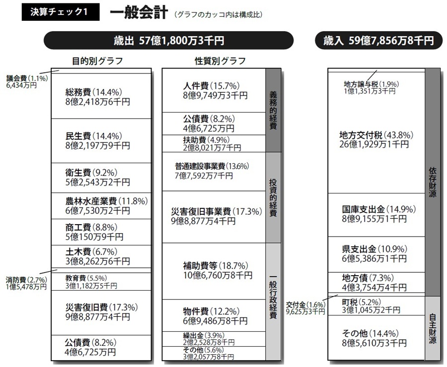 歳入・歳出のそれぞれの内訳は、歳入については、依存財源(町自体で確保できない収入:主に交付税や国・県からの支出金、町の借金)が全体の80.5%で、その中でも特に地方交付税が全体の43.8%を占めており、依存財源に頼らざるを得ない状況となっています。