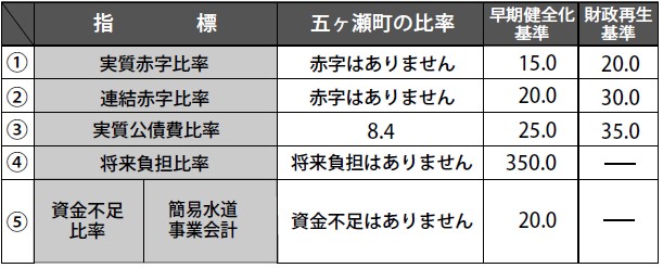 令和6年度の財政指標において、五ヶ瀬町は健全な財政運営を維持しています。以下の表に示す「健全化比率」は、すべて国が定める早期健全化基準以下であり、財政面で安定した状況となっています。