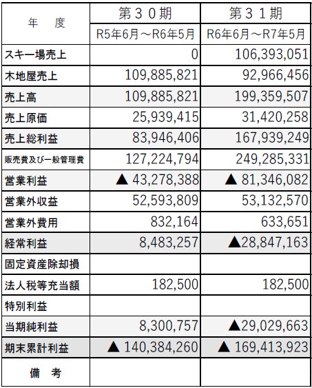 スキー事業部においては、3期ぶりのオープンを果たし、来場者数19,847人、営業日75日の結果となりました。営業休止期間に進んだ設備の劣化等の修繕費や、リニューアルに向けた消耗品の購入等に多くの費用を要しました。来場者数が目標に達しなかったため、損益はマイナスとなりました。