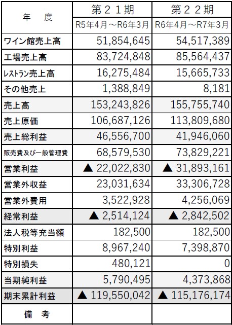 第22期の総売上高は155,756千円で前年比2,512千円増(101.6%)となりました。しかしながら、コロナ禍以降の物価高騰に歯止めが掛からず、嗜好品である酒類の消費量の落ち込みが顕著で、ワイン出荷数量は伸び悩みました。一方で、観光庁の補助金(委託事業)を活用してワインツーリズムに取組んだことで、県外からの観光客は増加しました。最終的な当期純損益は4,374千円の利益計上となり、2期連続での黒字決算となりました。