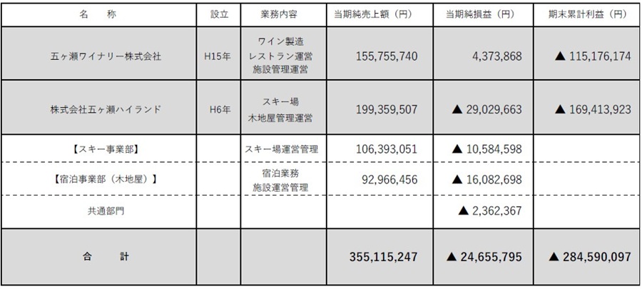 しかし、両社とも新型コロナウイルス感染症や物価高騰等の影響を受け経営が悪化、また、スキー場においては、令和4年台風14号の影響で2シーズン営業が休止となり、関係各位のご協力を得て令和6年12月に営業を再開したものの、入場者が伸びずに厳しい経営状況となりました。(表1)