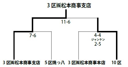 決勝は昨年と同カードの3区(株)松本商事支店と10区が戦し、乱打戦を制した3区(株)松本商事支店が見事2年連続の優勝を果たしました。