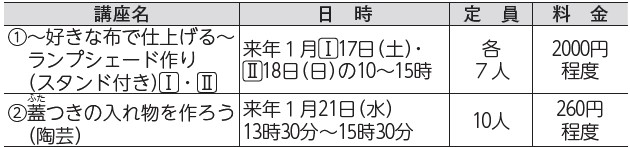 申込み:往復はがきかファクス、メールで各講座の14日前(必着)までに同施設【E-mail】[email protected]へ