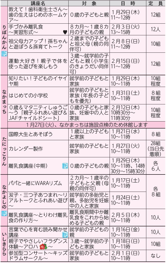 ・申し込み方法やその他の講座・イベントは、りぼんかんだより、各親子つどいの広場へ
