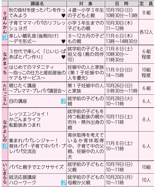 *申し込み方法やその他の講座・イベントは、りぼんかんだより、各親子つどいの広場へ