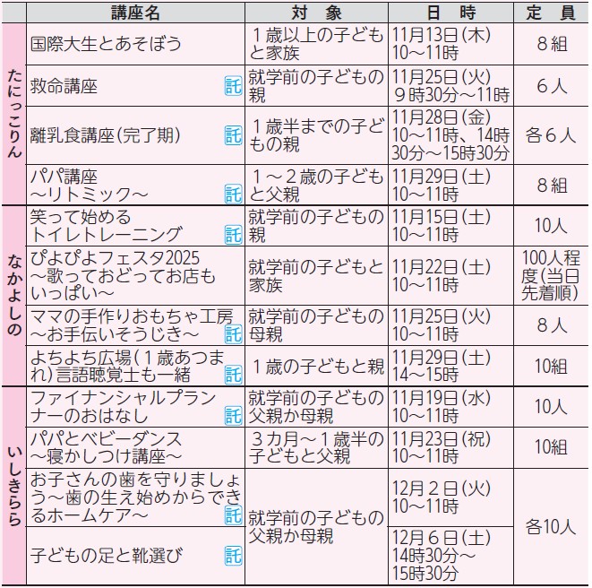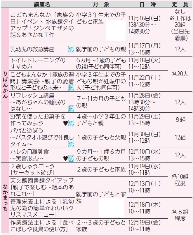*申し込み方法やその他の講座・イベントは、りぼんかんだより、各親子つどいの広場へ