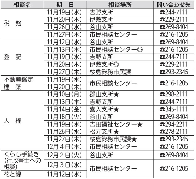 相談時間:13~16時(◎は司法書士との相談のみ、★は10~15時)