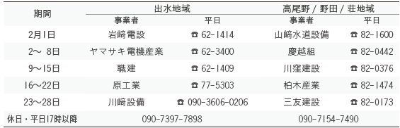 くらし 水道修繕 工事当番事業者 26/28 前の記事 次の記事 発行日 : 2026年02月01日 自治体名 : 鹿児島県出水市 広報紙名 : 広報いずみ 2月号(2026年2月1日発行) ※家庭内の修繕は施工した工事事業者にご連絡ください。 Tweet シェアする 休日当番医・薬局 クレインパークだよりNo.233