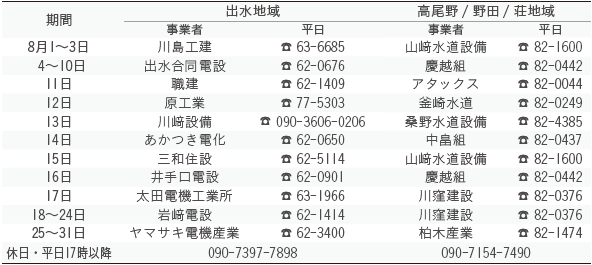 くらし 水道修繕 工事当番事業者 26/28 前の記事 次の記事 発行日 : 2025年08月01日 自治体名 : 鹿児島県出水市 広報紙名 : 広報いずみ 8月号(2025年8月1日発行) ※家庭内の修繕は施工した工事事業者にご連絡ください。 Tweet シェアする 休日当番医・薬局 クレインパークだよりNo.227