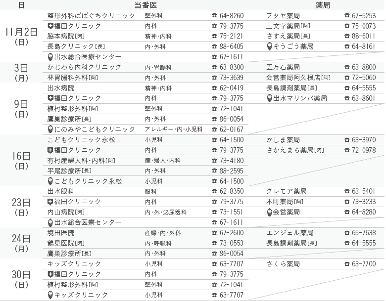 ※都合により担当医療機関が変更になることがあります。出水消防署[【電話】63-0119]にお問い合わせください。