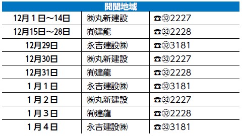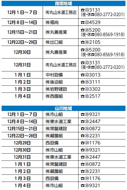 くらし 水道工事当番店 23/27 前の記事 次の記事 発行日 : 2025年12月01日 自治体名 : 鹿児島県指宿市 広報紙名 : 広報いぶすき 2025年12月号 ※水道工事に関する当番店です。下水やトイレの詰まりなどは、なじみの工事店にお願いしてください。宅地内の漏水もできるだけ設置業者へ修理依頼をお願いします。 Tweet シェアする 日曜・祝日当番医/日曜・祝日薬局/長期休日当番歯科医 人のうごき