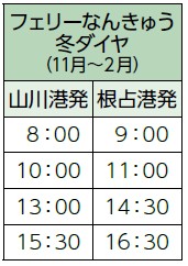 フェリーなんきゅうが、11月1日(土)から冬ダイヤに変更します。出航15分前までに、乗船手続きを済ませてください。