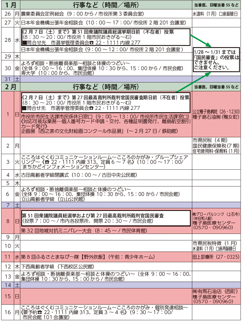 イベント 1月行事など(時間/場所)当番医、日曜当番SSなど 1/5 次の記事 発行日 : 2026年01月25日 自治体名 : 鹿児島県西之表市 広報紙名 : 広報にしのおもて 市政の窓 お知らせ版 令和8年1月25日号 Tweet シェアする お知らせ
