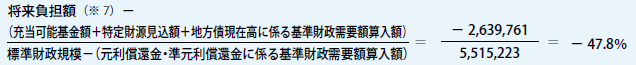 ◆将来負担額(9,505,983千円)、充当可能基金額(5,710,809千円)、特定財源見込額(309,042千円)、地方債現在高に係る基準財政需要額算入額(6,125,893千円)、元利償還金・準元利償還金に係る基準財政需要額算入額(840,584千円)を、算定式にあてはめた結果、-47,8%となり将来負担比率は発生しない「-」ということになります。