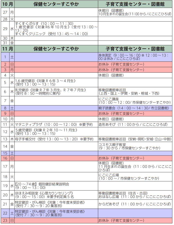 子育て 10月保健センターすこやか・子育て支援センター・図書館 5/5 前の記事 発行日 : 2025年10月25日 自治体名 : 鹿児島県西之表市 広報紙名 : 広報にしのおもて 市政の窓 お知らせ版 令和7年10月25日号 Tweet シェアする その他のお知らせ(広報にしのおもて 市政の窓 お知らせ版 令和7年10月25日号)