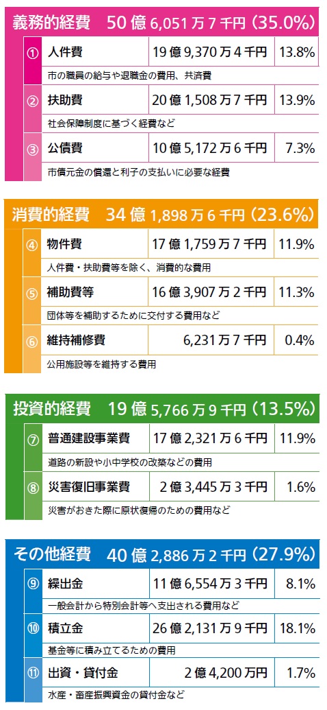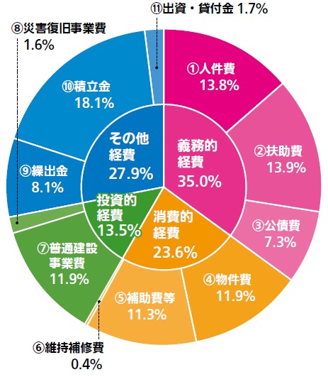 義務的経費は、人事院勧告に基づく会計年度任用職員及び職員の給与改定と職員数の増により人件費が増加しています。消費的経費は、物価高騰による各種委託料の増加に加え、情報システム標準化に伴う環境構築委託料、ふるさと納税制度事業に係る役務費等や、消防・救急デジタル無線設備強化事業の業務委託料により増加しています。投資的経費は、垂水小学校屋内運動場長寿命化改良工事、市役所本庁舎と消防庁舎の耐震改修工事、高規格救急車更新、庭球場管理棟改修工事により増加しています。〔表4〕