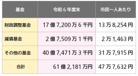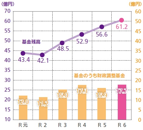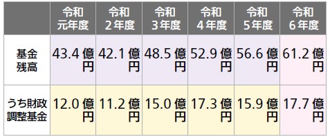 基金は、「市の貯金」です。特定の目的を計画的に実施できるよう財産を維持し、資金を積み立てまたは定額の資金を運用するもので、条例で設置されるものです。特に大きく増加したのはふるさと応援基金です。財源不足の調整のために使われる財政調整基金は、令和5年度より1億8030万9千円増加し、17億7200万6千円になりました。〔表5〕〔表6〕