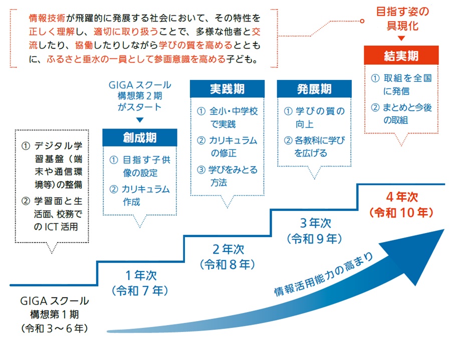 これまでのGIGAスクール通信でお知らせしたとおり、本市は令和7年度から令和10年度までにかけ、全国に先駆けて情報技術等について先進的に学ぶ、「情報活用科」を市内全小・中学校に新設します。