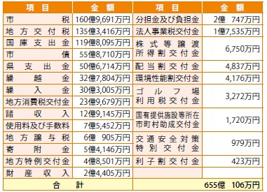 歳入は、市税が160億9691万円で最も高く、地方交付税が135億3416万円、国庫支出金が119億8095万円と続きます。