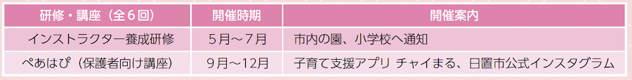 日置市では、保育士、幼稚園・小学校教諭、発達支援に関わる方などを対象とした、支援者向けの「ペアトレ・インストラクター養成研修」や、保護者向けのペアトレ講座「ぺあはぴ」を開催しています。