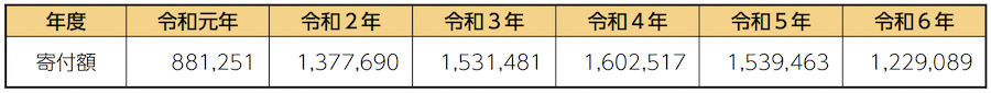 平成28年度から日置市では、インターネットによる寄付受付やクレジットカード決済などを導入し、寄付を行いやすい環境を整えました。また、市内の100以上の事業者から500品を超える日置市自慢の返礼品をご準備した結果、令和6年度は全国の皆さまから総額12億2908万9千円ものご寄付をいただきました。