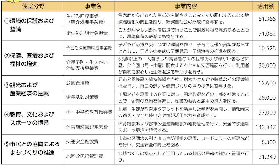 本市においては、寄付金を適正に管理するため、「日置市まちづくり応援基金」を設置しており、その基金への積立を行い、翌年度に次の分野の事業に活用させていただくことにしています。
