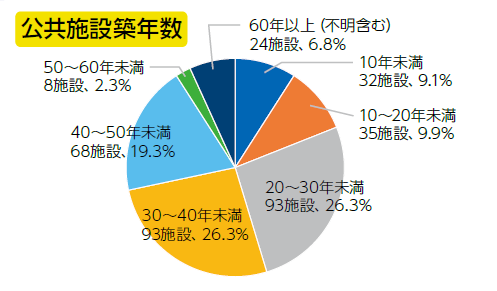 2025年4月現在、そのうちの約54.7%にあたる193施設が築30年以上経過しており、また、築20~30年未満の施設数も多く、今後、10年間でさらに多くの施設が老朽化のピークを迎えます。