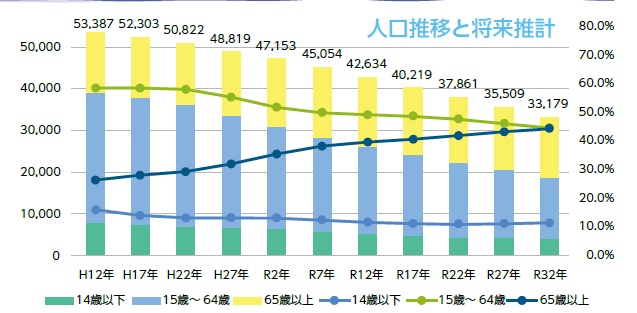 日置市(合併前含む)の人口は平成12年の53,387人をピークに年々、減少しており、令和7年10月1日現在では45,720人、令和32年には33,179人と今より12,500人余り減少することが見込まれています。