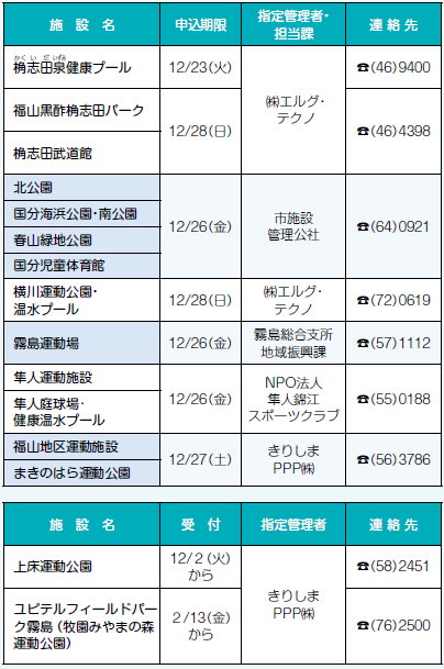 問い合わせ先・申込先:対象施設を管理する指定管理者・担当課