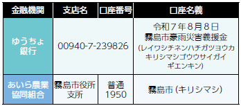 被災した市民の生活を支援するため、義援金を受け付けています。銀行口座振り込みまたは市役所(本庁・隼人市民サービスセンター・各総合支所)に義援金箱も設置しています。1日も早い復旧・復興のため、皆さまの温かいご支援をお願いします。
