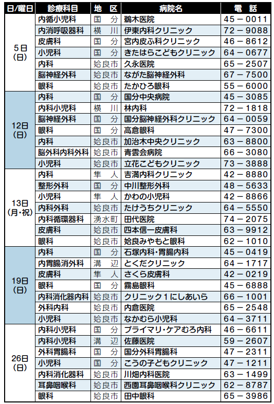 ■日曜・休日在宅当番医表(10月) 姶良地区医師会