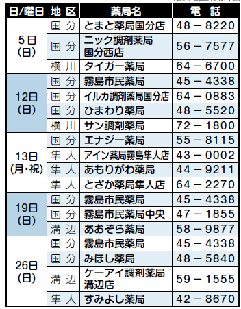 ※12日(日)ひまわり薬局、19日(日)霧島市民薬局中央は、午前9時〜正午。