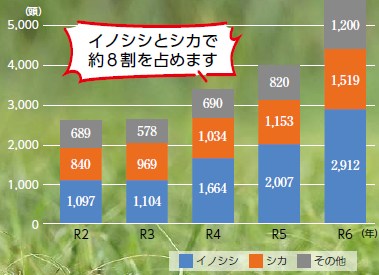 近年、全国的に問題になっている野生鳥獣による被害。市においても例外ではなく、捕獲頭数は増加傾向にあります。(グラフ)