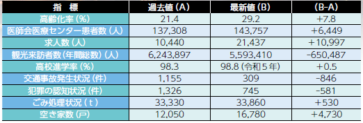 一方で、時代の流れと共に高齢化率は7・8%上昇し、市立医師会医療センターの患者数も増加。高齢化が進む中で、誰もが健康に生活できる地域の体制や仕組みづくりが重要になっています。また、減少に転じた観光客数は新型コロナウイルス感染症や災害などの影響を鑑み、地域のさらなる魅力発信や資源の活用方法を考えていかなければなりません。