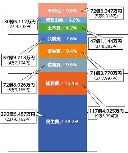 民生費…高齢者や障がい者、児童の福祉推進などに使われたお金