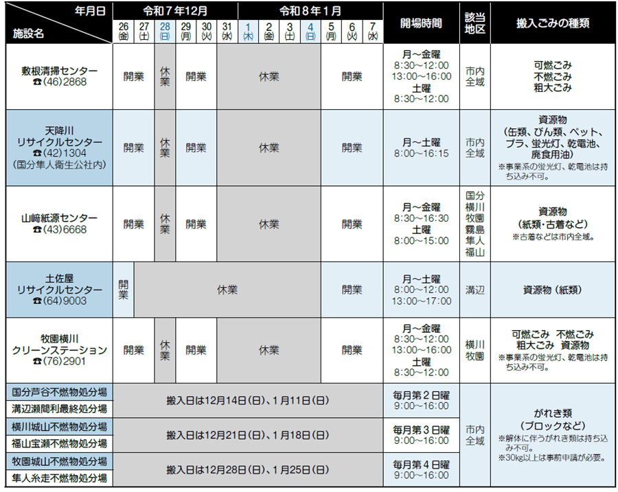 休業期間は下表のとおりです。各地区のごみの収集日は配布しているごみ収集日程表や市ホームページ、ごみ分別アプリ「さんあ~る」などで確認ください。