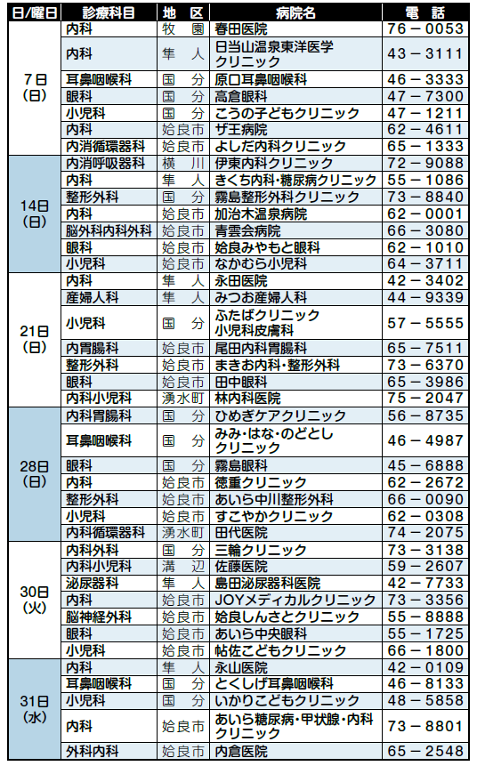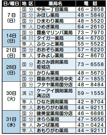 ※7日(日)ひまわり薬局、28日(日)霧島市民薬局中央は、午前9時~正午。30日(火)・31日(水)あもりがわ薬局は午後1時~10時。