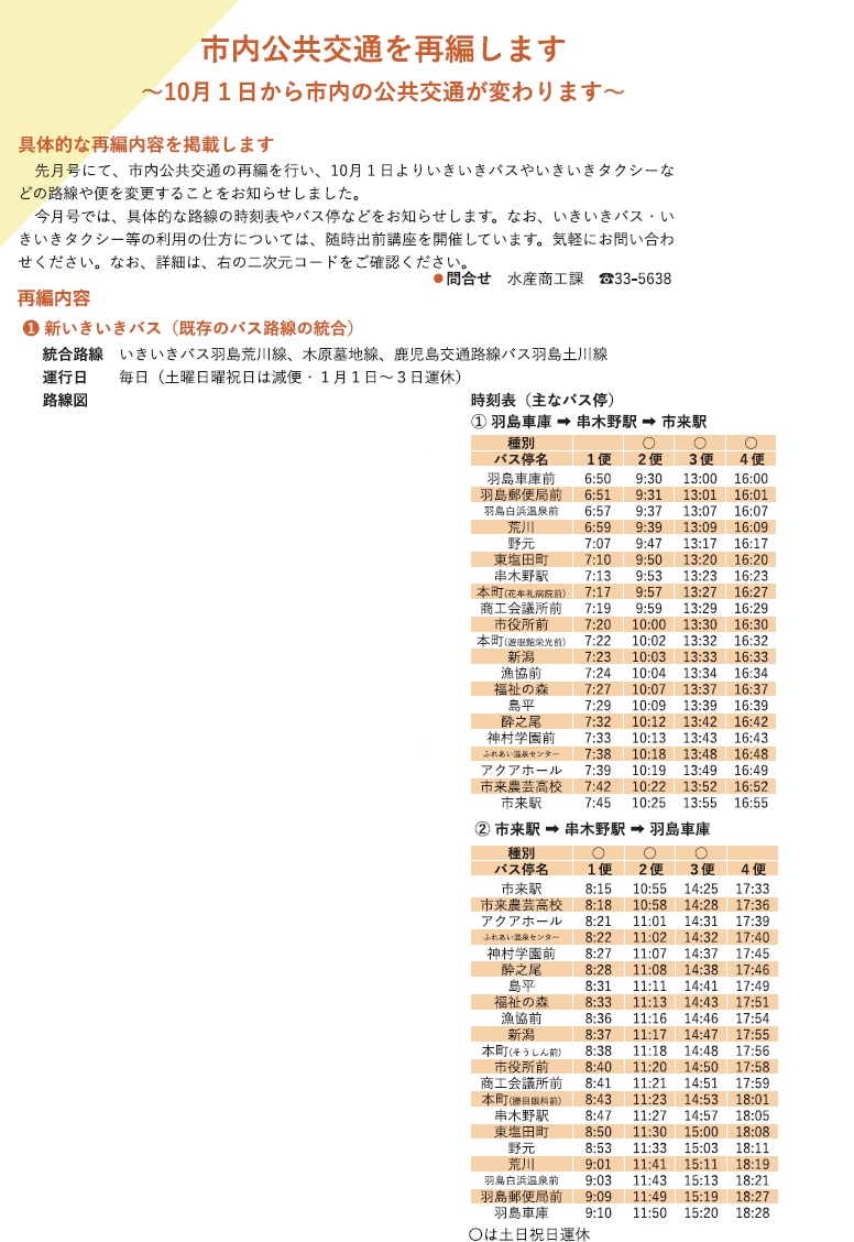 くらし 市内公共交通を再編します 2/35 前の記事 次の記事 発行日 : 2025年09月22日 自治体名 : 鹿児島県いちき串木野市 広報紙名 : 広報いちき串木野 令和7年9月22日号(第239号) ※路線図は本紙をご覧ください。 Tweet シェアする みらいトーク2025 シリーズ 20周年を祝う ~いちき串木野市誕生20周年~