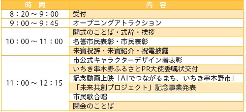 10月11日(土)に、記念式典をいちきアクアホールにて開催します。オープニングアトラクションをはじめ、各種表彰、記念動画上映などを行う予定です。市民の皆さまのご来場をお待ちしています。