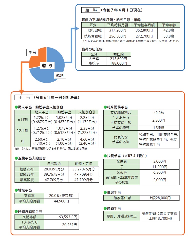 職員の給与は、基本給としての給料と、扶養手当や通勤手当などの一定の条件にあてはまる場合に支給される手当から成り立ちます。
