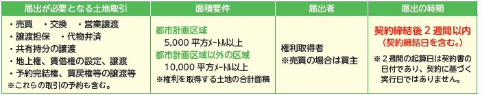 国土利用計画法では、土地の投機的取引や高騰を抑制するとともに、適正かつ合理的な土地利用の確保を図るため、土地の売買等について届出制を設けています。一定面積を超える土地の取引をしたときは、土地が所在する市町村を通じて県知事に届け出る必要があります。