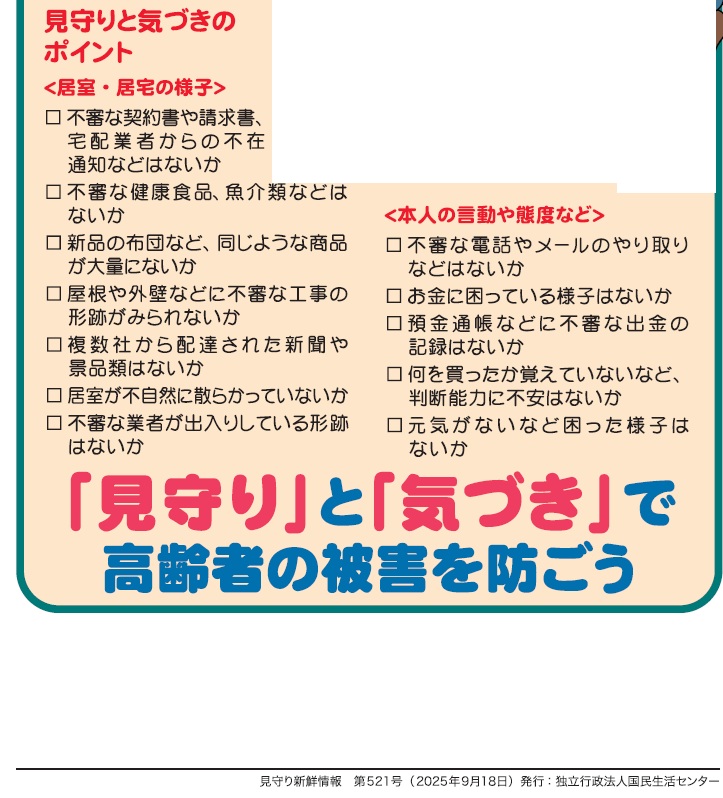 ・「知らない電話には出ない」「その場で契約せず家族や周囲に相談する」など対応策も伝えましょう。地域の見守り活動や留守番電話機能なども活用しましょう。