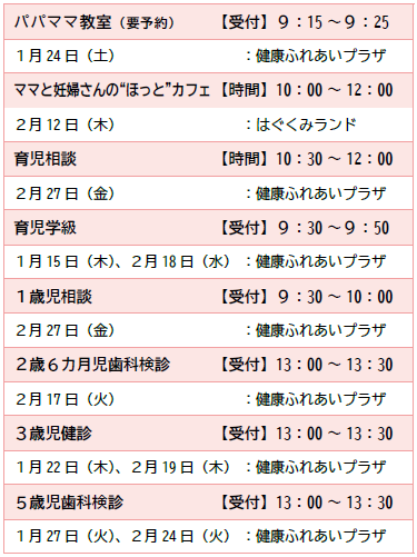 子育て 親子健康カレンダー(1月・2月) 23/48 前の記事 次の記事 発行日 : 2026年01月14日 自治体名 : 鹿児島県志布志市 広報紙名 : 市報しぶし 2026年1月号 ※母子健康手帳をもらうためには事前申込が必要です。 Tweet シェアする キラリ輝く「しぶしっ子」育成講演会 日曜・祝日当番医